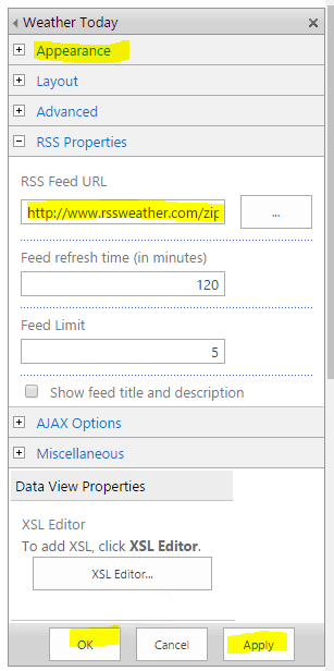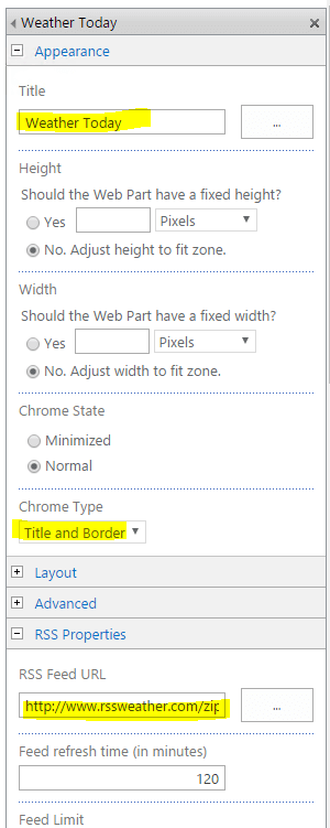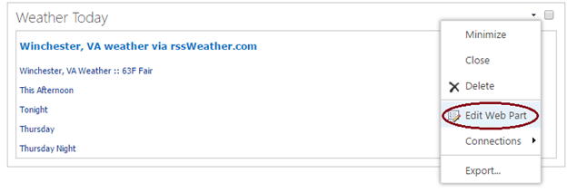After adding the WebParts to the page, you can provide some configuration details in the Tool part (right-side window) by clicking the down arrow in the WebPart header.