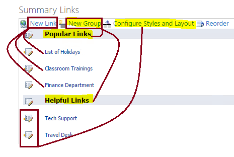 For Summary Links, you can add the links and header from the tools (links) at the top of the WebPart, as shown below.