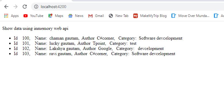 Now run this project using the command " ng serve ". and after compiling successfully you have to open the browser and hit " localhost:4200". after a few second your data will be shown like below.