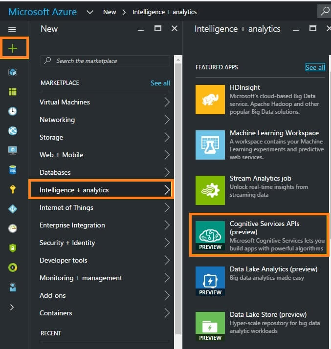 Click “+NEW” and choose “Intelligence + Analytics”. Select “Cognitive Service API”.