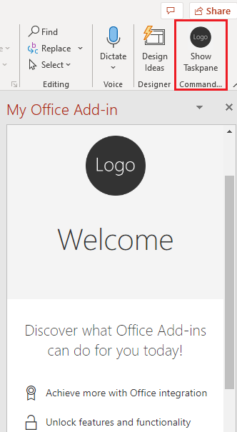 Step 8: Once you run above command it opens PowerPoint desktop apps with your add-ins. You can see your add-ins in Home Tab.