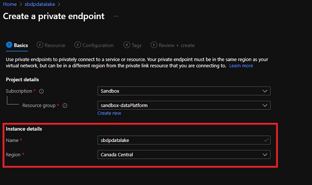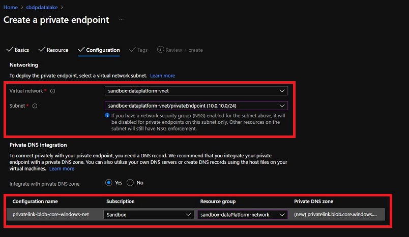 In order to keep the services organized, I created a dedicated resource group for all networking components (sandbox-dataPlatform-network). I created a subnet called 'privateEndpoint' for all the Private Endpoints. Alternatively, you can create different subnet for each Private Endpoint type. Click 'Next: Tags >' to continue the wizard.