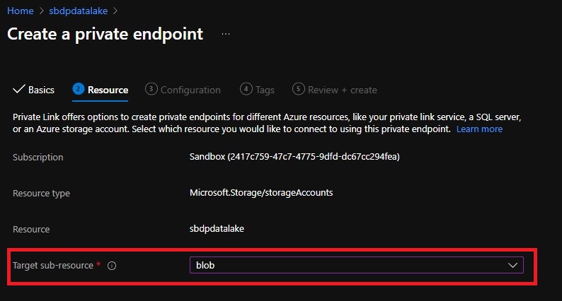 Private endpoint is available for various types of storage services. For the data lake, we need to create a Private Endpoint for 'blob' and 'dfs'. Since we can only select 1 sub-type, we will select 'blob' first. Click 'Next: Configuration>' to continue the wizard.