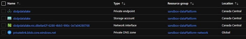 After setting up the Private Endpoint, we should see the following resources in Azure portal. We see the Private Endpoint, the network interface, and the Private DNS zone.