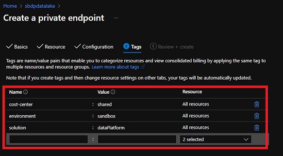 Finally, we will create the tags required for cost management. Since the data lake will be used by many projects, the new services are assigned to the 'shared' cost center. Click 'Next: Review + create >' to continue the wizard.