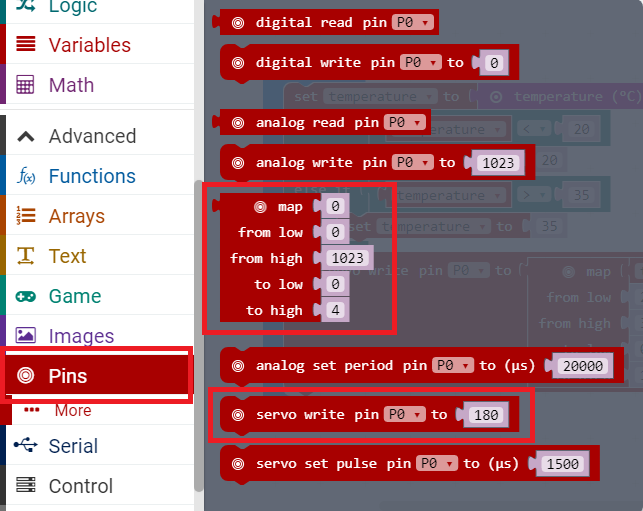 Go to pins and then choose map block and servo write block.