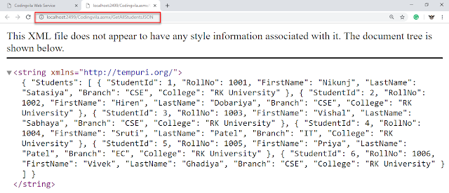Then you need to add the following method in your created web service (Codingvila.asmx.cs) file to retrieve all records from the student's table.