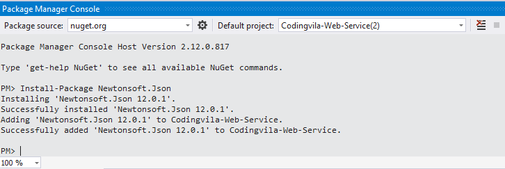 After successful installation of the package you have to add the reference Newtonsoft.Json in your created web service (Codingvila.asmx.cs) file.