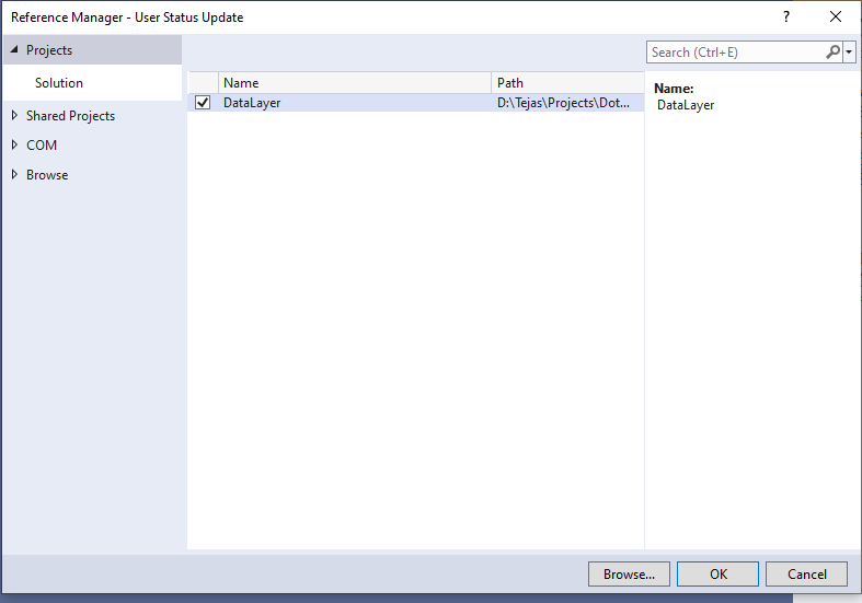Step 5. Next, we add Project reference into the Main Project (User Status Update) used for DataLayer Functions