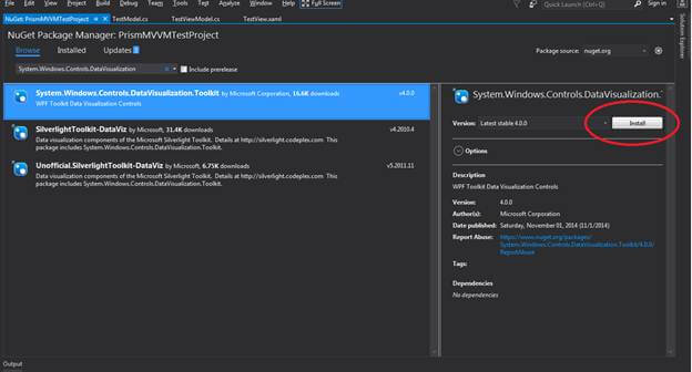 - For charting controls, type ‘System.Windows.Controls.DataVisualization ‘ in browse section, select that package, and click "Install" button.