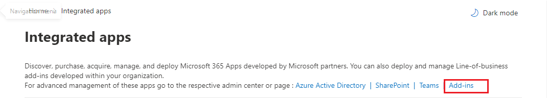 Select Add-ins from the Integrated apps page. Or you can open it directly using the below link.