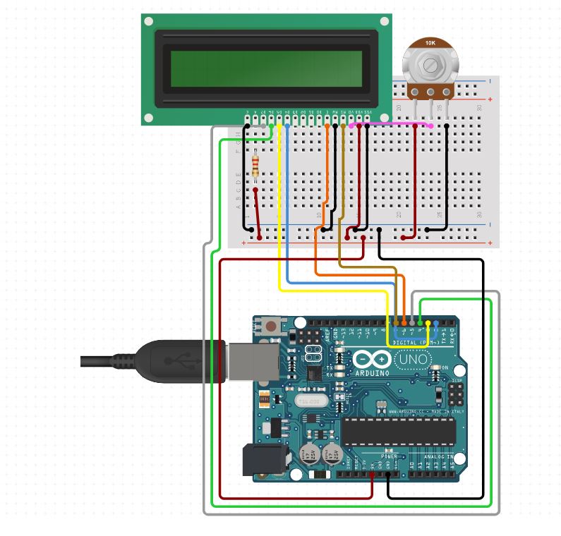 Place a 10K ohm potentiometer near the LCD crystal display. It can adjust the contrast of the LCD screen and create a power connection from Arduino +5V and GND right and left end of the potentiometer. Make a connection from the center terminal of the potentiometer to VEE (contrast control) LCD crystal display. (Refer to the connection diagram)