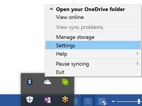 It is easy to disable OneDrive sync on Windows 10. Just right click on the notifications icon and select OneDrive. When you right-click on it, you will see several OneDrive options including "Settings". See below.