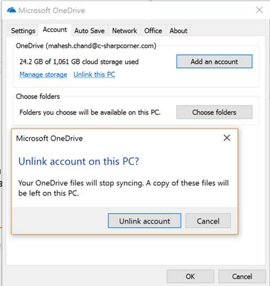 For that, go to the "Account" tab and select “Unlink this PC”. This action will stop OneDrive syncing. A popup will ask you to confirm the action, as shown below.