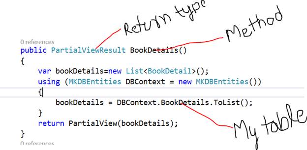 ->So, see in brief, How to create partial view, For that write partial method and give the return type PartialViewResult and write the code for fetching the records form database like below