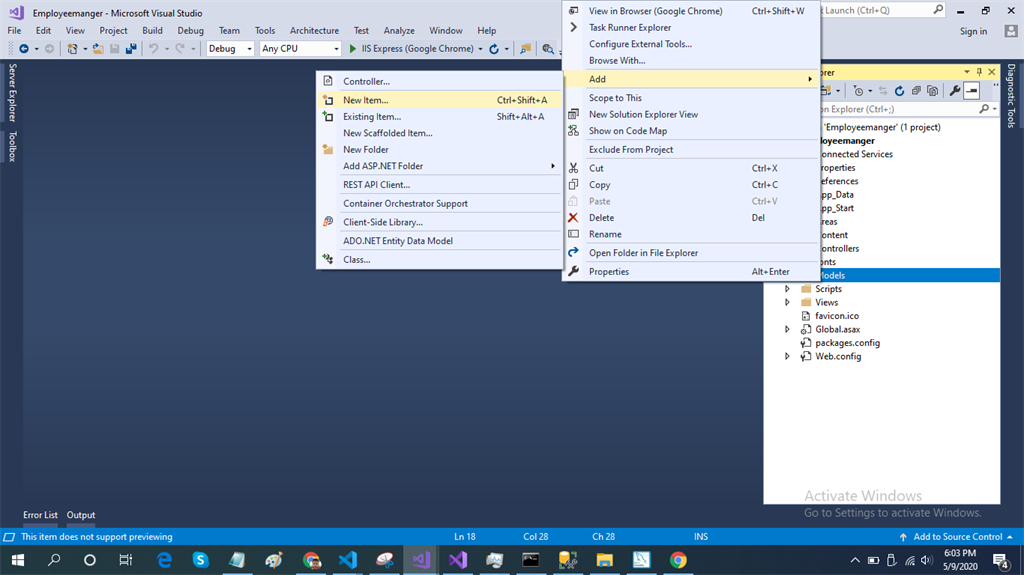 Right-click the Models folder from Solution Explorer and go to Add >> New Item >> data.