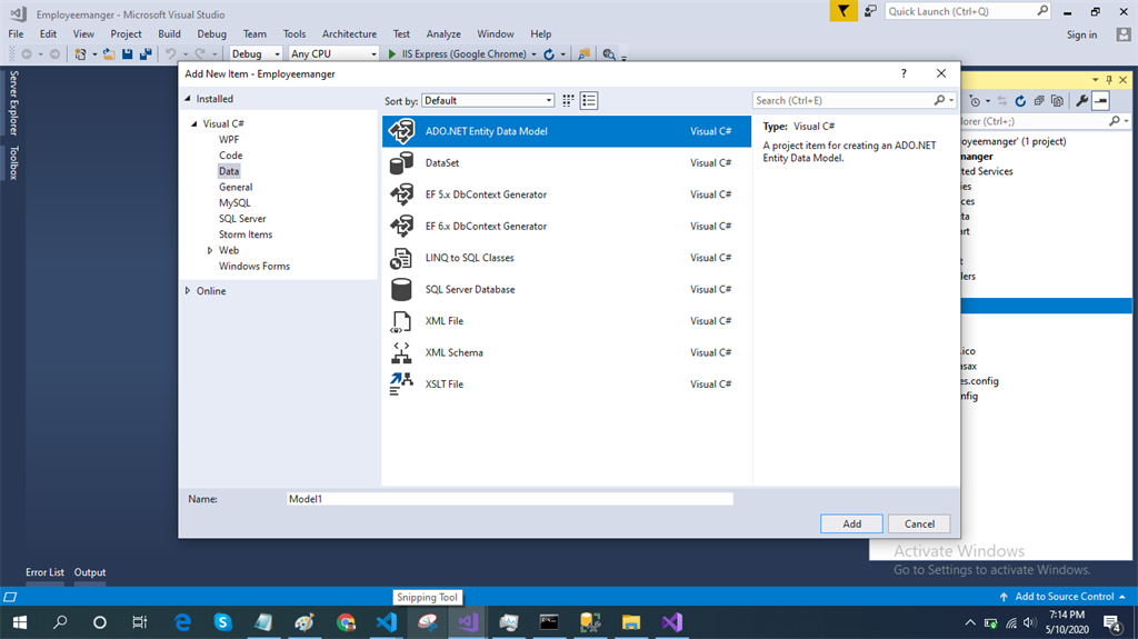 Click on the "ADO.NET Entity Data Model" option and click "Add".