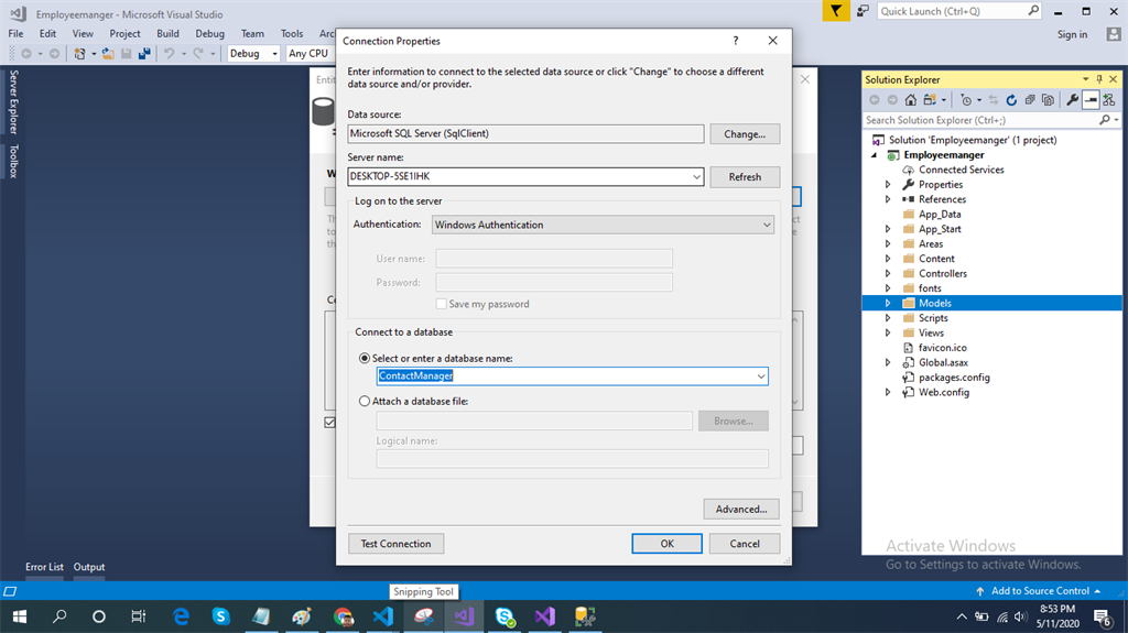Open SQL Server Management Studio and create a database named "contactmanager". In this database, create a table. Give that table a name like "demodata".