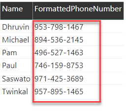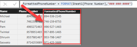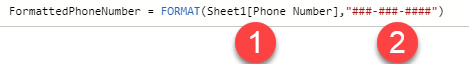 - FormattedPhoneNumber = FORMAT(Sheet1[Phone Number],"###-###-####")