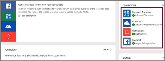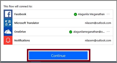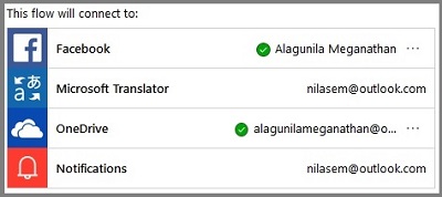 After configuring Facebook, the Microsoft Translator automatically gets configured. To configure the Notification, we need to install the Microsoft Flow App in the mobile. We can configure it here with the same mail ID.