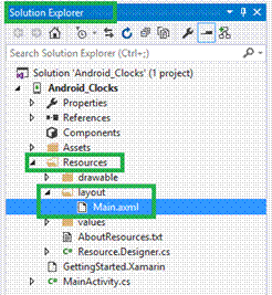 Step 3 Now, go to Solution Explorer. In Solution Explorer, get all the files and sources in your project. Subsequently, select Resource-->Layout-->double click to open main.axml page. To write XAML code, you need to select the source. Choose the Designer Window, if you want to design it, and you can design your app.