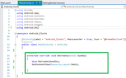 MainActivity.cs - protected override void OnCreate(Bundle bundle) {