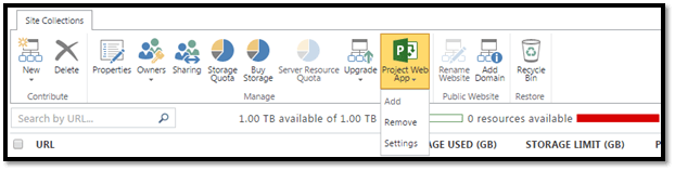 After selecting the sites, click on Project Web app settings on the top ribbon, as shown below.