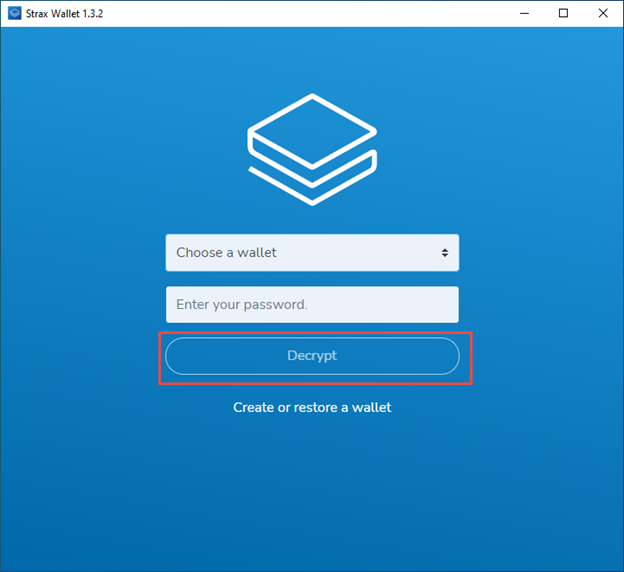 Open your wallet, choose a wallet name, and provide your password for the wallet, and click on Decrypt as illustrated.