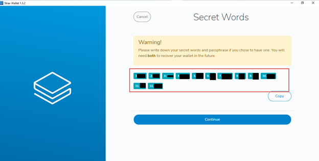 Then you will get Secret words (12 words - mnemonic). Copy these words and keep them safe. It will be needed in the future while restoring/recovering the wallet. Then click on Continue.