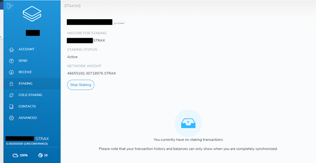 After 100% synchronize, click on Stalking as depicted below. Note that for staking you must have Strax in your wallet so if you don’t have Strax, share your wallet address and deposit the Strax in your wallet.