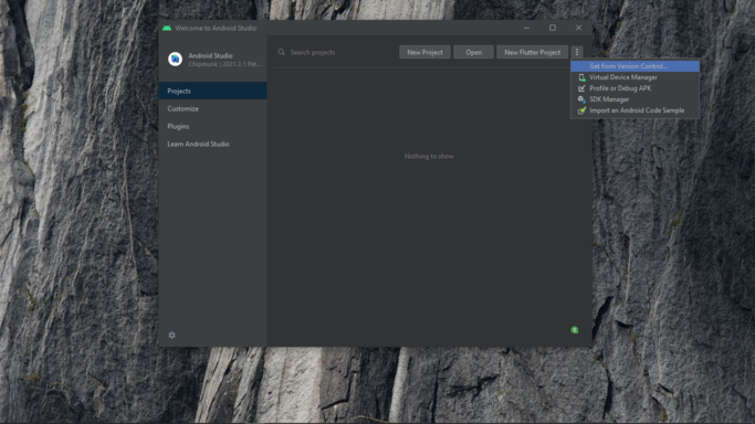 Open Installed Android Studio and click the menu icon on the right-side top of the application.