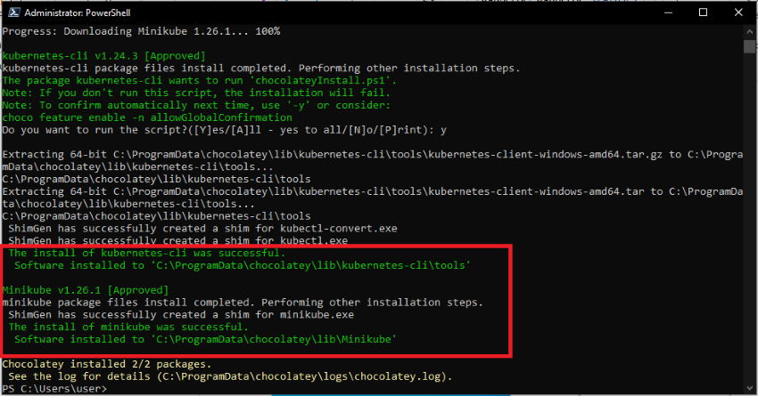 Use the following commands, choco install minikube. It will download Kubernetes-cli and the minikube package. Select Yes to confirm installation.