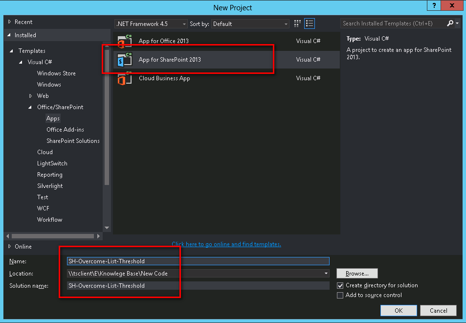 - Create SharePoint App Project by choosing "App for SharePoint 2013" Project Template.