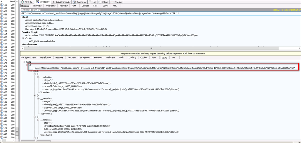Step 11: On successful execution of this request, response object would return back with a property “__next” which contains the direct URL to the next set of records that can be queried from the list. Check for this property and make sure it exists, before proceeding further.
