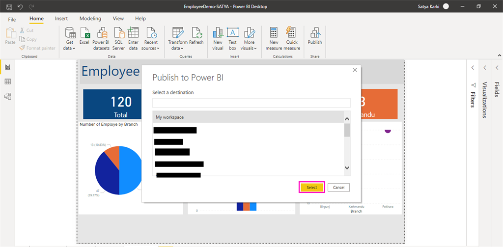 Once, you click on Publish option, you will get all of your workspaces to which you have access to publish Power BI reports. Select the workspace where you want to publish your report and click on the Select option as shown below image.