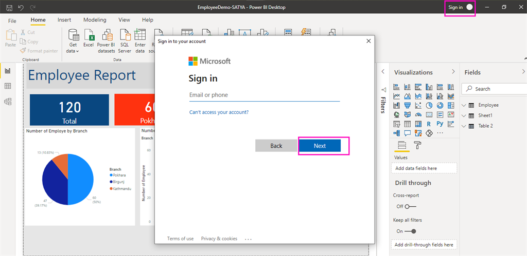 Once open the Power BI Desktop, there is a sign-in option as depicted below. Login to Power BI Desktop using your Power BI account. It means that you need to use your account which has Power BI service access or licenses. Provide your email address and click on Next.