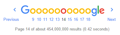 As you can see, the middle page numbers start to pad out ... this can get very messy very quickly. A good way to handle this is to visually shift the range of where you are indicating the user is in the view... here's how Google do it for example.. note the results start now at 9 and go to 18, and they tell us its page 14 of gazillions.... (they also give themselves a pat on the back for the speed of the result, and that's fine :))