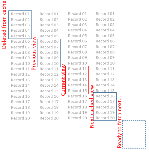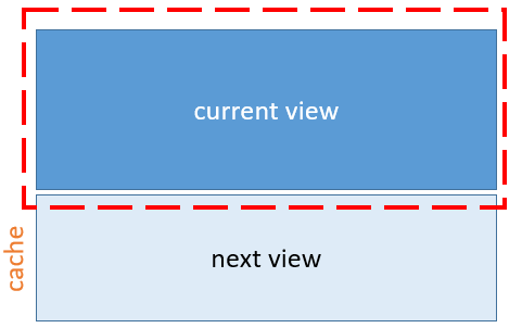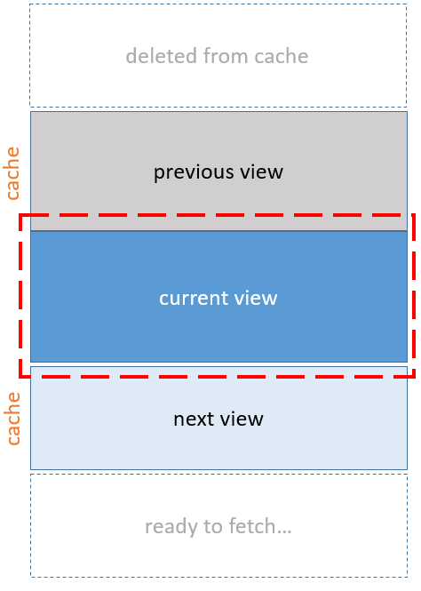 When we load up our webpage/app in the first place, we have a single default view ready for the user. This is the 'current view' shown below. In our app we know that the next thing the user will do is use their thumb/mouse to scroll the next piece of data into view. In this case, we already have our 'next view' loaded on the device/page, and are ready to show it immediately, there is no delay or distraction to the user experience. This 'next view' is cached by default, and ready to use. From a practical point of view, this means that when we set the page up, we load not only the current view, but also the 'next view' - the next view is not visible, but cached off-screen, and ready to use on-demand.