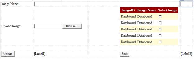 Open your grid_demo.aspx file to create our design. We will drag an HTML table, a FileUpload control, two buttons and a label, and a Textbox and GridView.