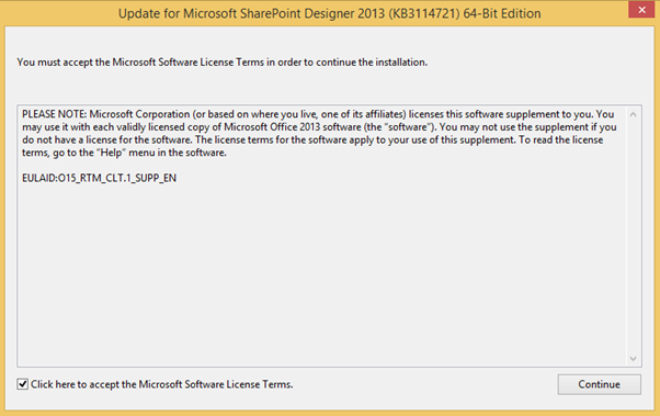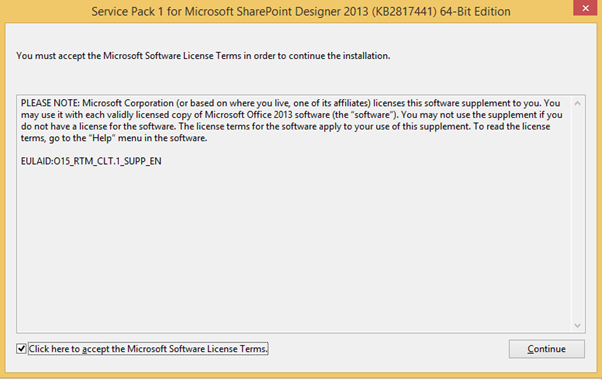 - It will open the License agreement dialog. Read the terms and click on “Click here to accept the Microsoft Software License Term”. Once checked, continue button will be enabled. Click on Continue button.
