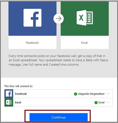 Now, both, Facebook and Excel, are connected to the flow. Just choose "Continue".