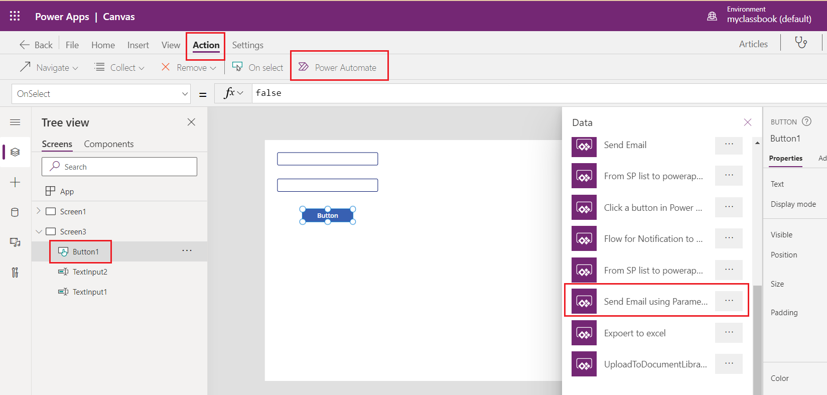 - Select the button and navigate to the Action tab and you will find the option to add a Power Automate