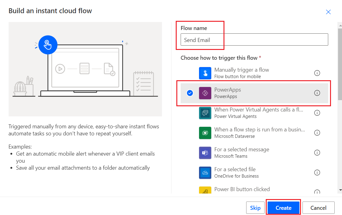 - Create an instant flow that has the trigger as PowerApps button. This flow will send an email to a fixed person.
