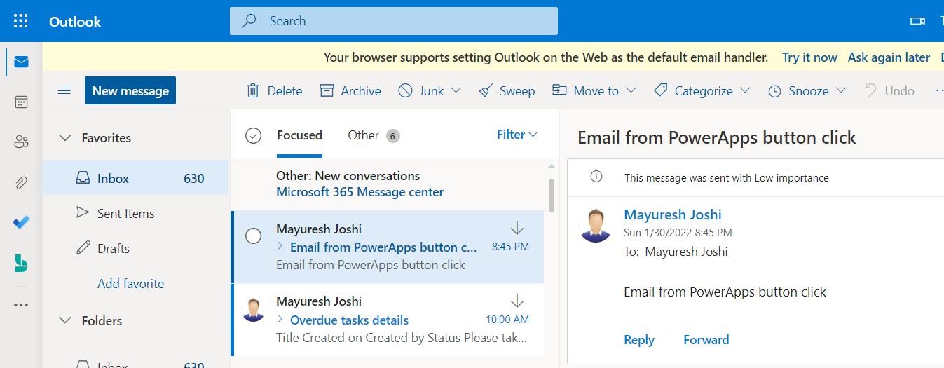 - Now when you click on a button, a flow will be triggered and it will send an email to the specified user as shown below: