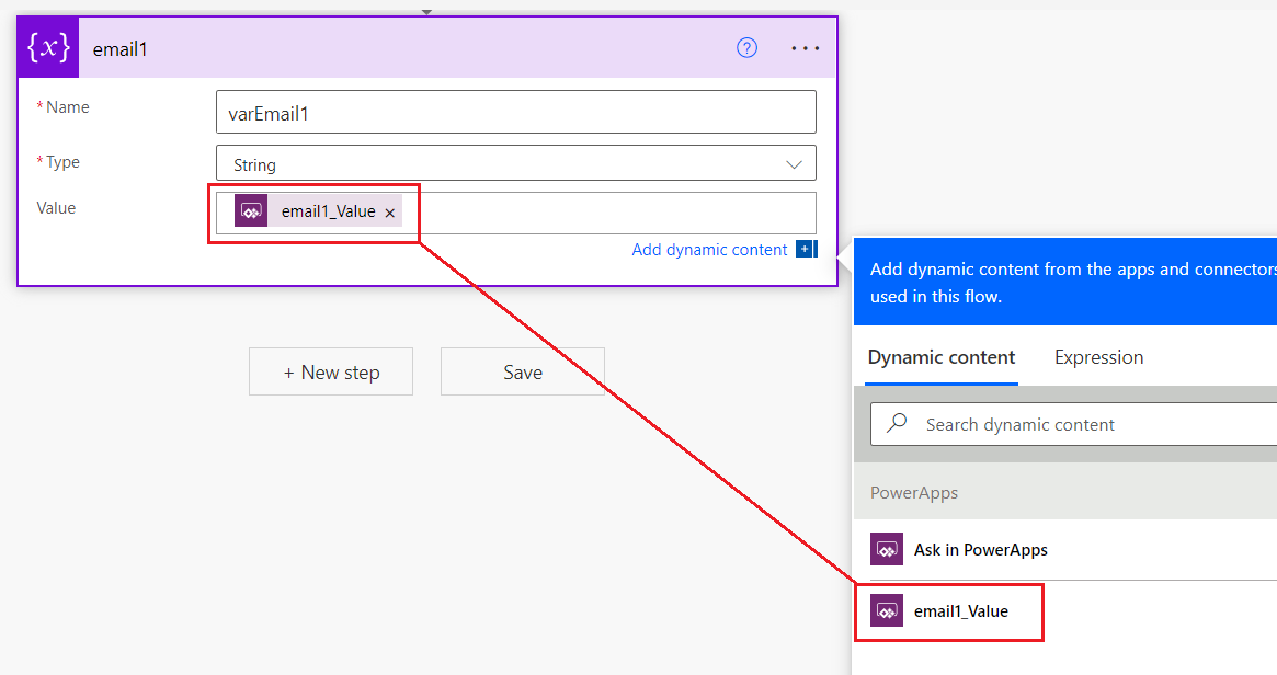 - Initialize the first variable with the name varEmail1 and choose the type as a string. Also, rename the action name to "email1". Renaming the action name will create a parameter with that name.