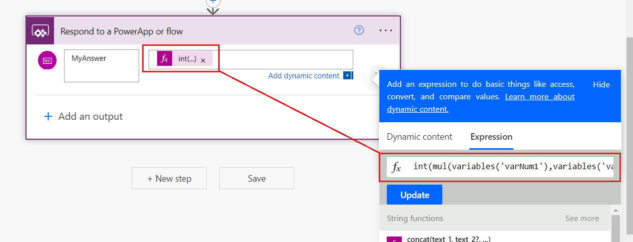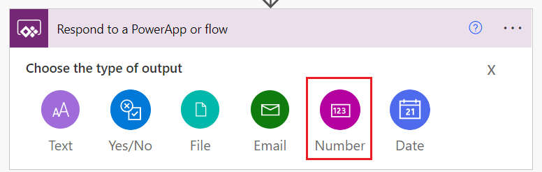 - Add an action called Respond to PowerApps, Use Type of Output as Number