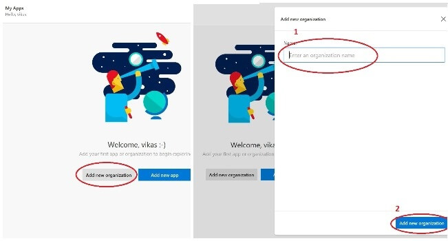 After creating organization you will see the organization name on dashboard and click on Add new app.
