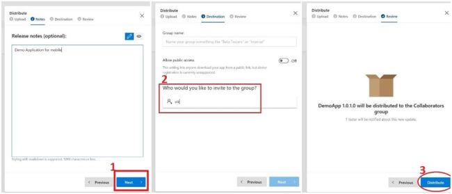 In step 8 give the Release notes and click next it will show Distribute link then set the mail Id for invite people. After setting mail go on Review and click Distribute button.