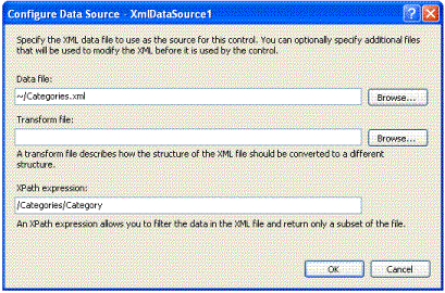 The Data Source Configuration Wizard for an XmlDataSource asks for just three items of information. First, you must use the DataFile attribute to provide a path to the XML data. In this example, the XML data comes from a file in the application’s App_Data folder, but you can also provide a URL for the XML file location. For example, you can create an XML data source that reads the news from reuters.com by specifying http://www.microsite.reuters.com/rss/topNews as the data file.