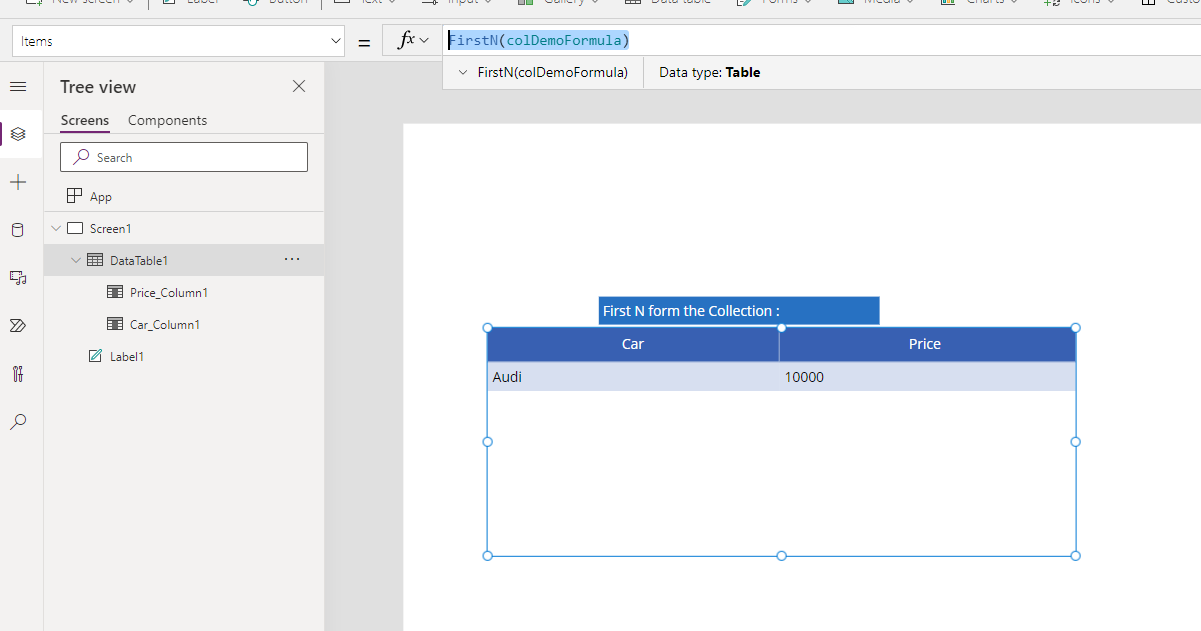 The FirstN function returns the first set of records of a table; the second argument specifies the number of records to return.